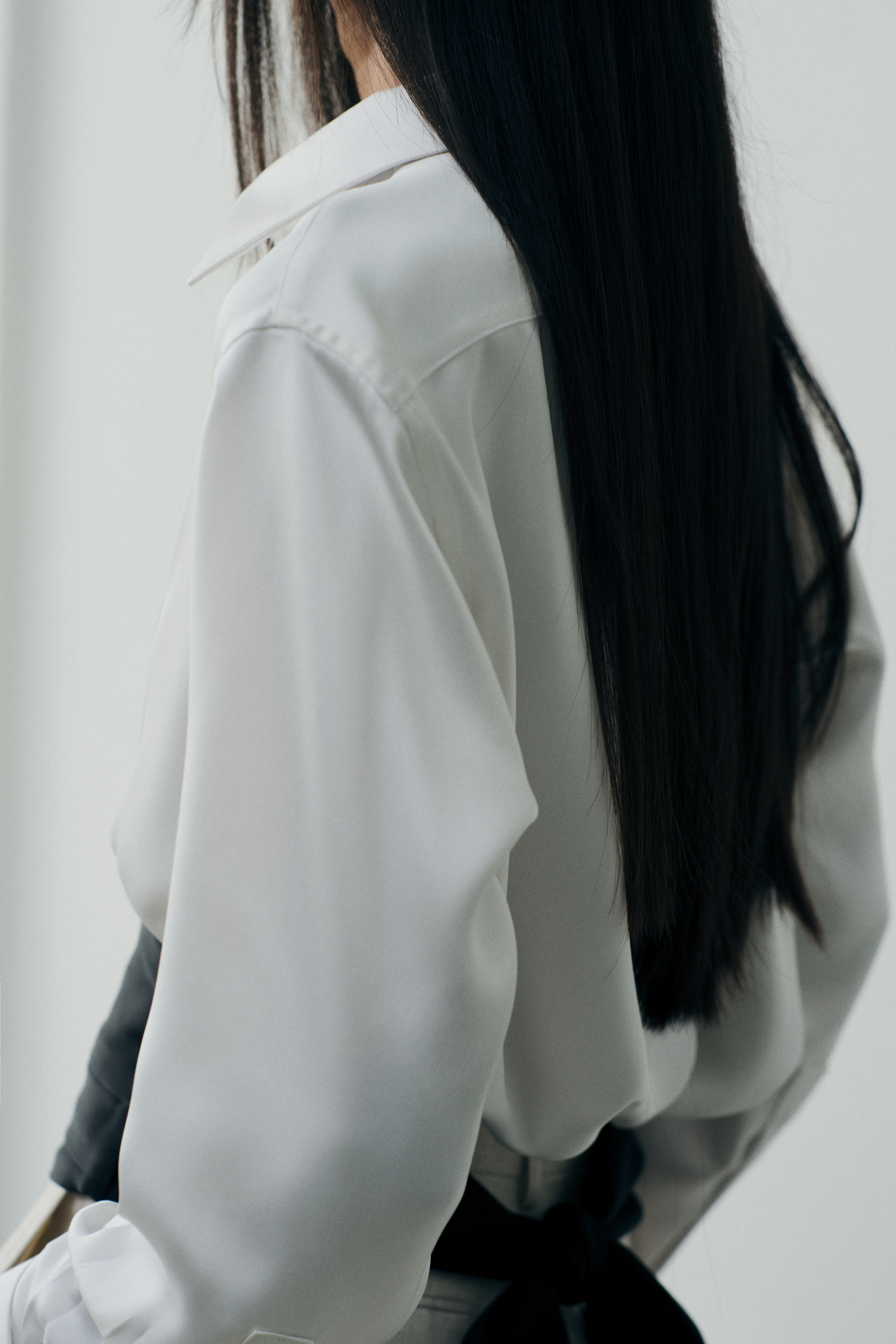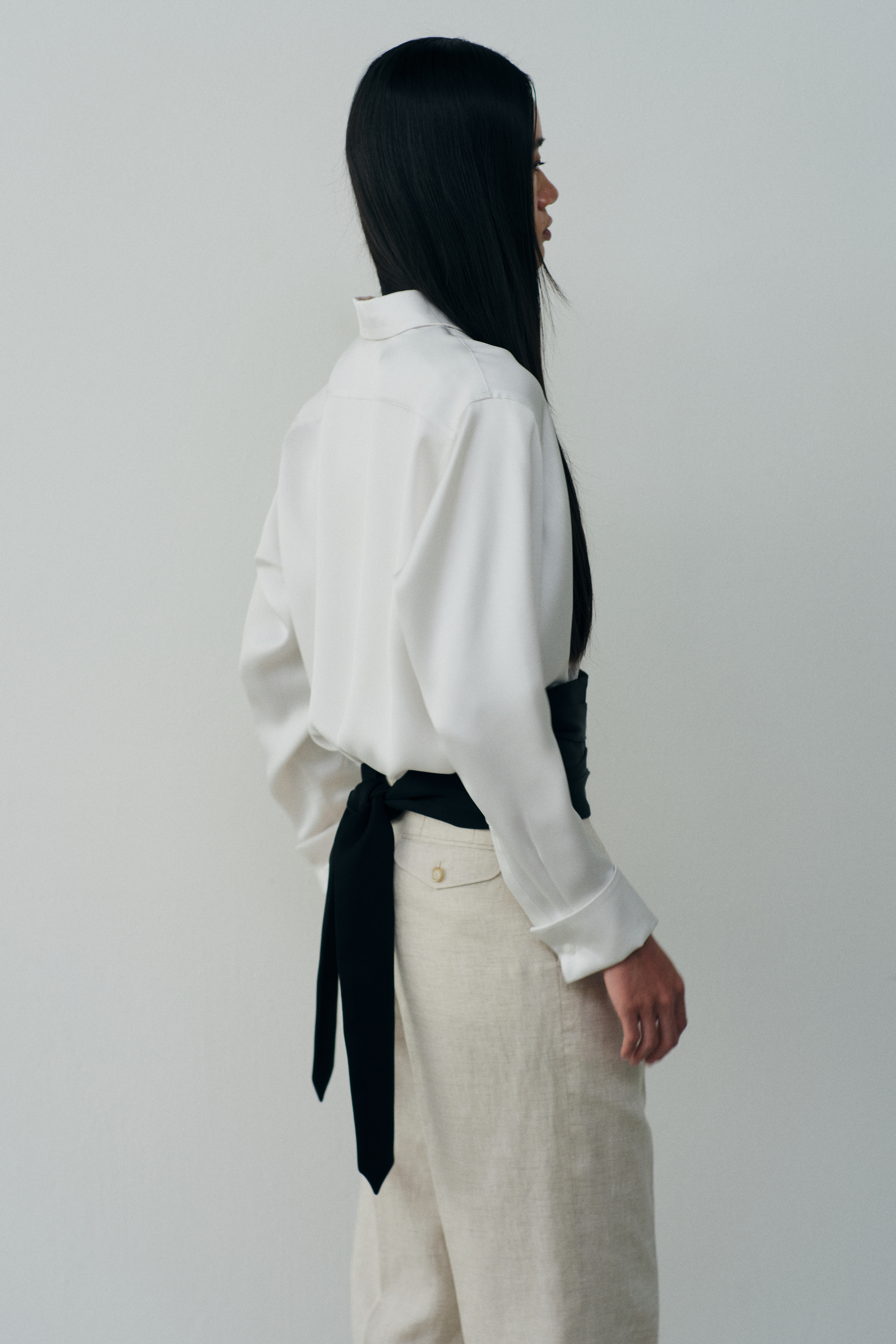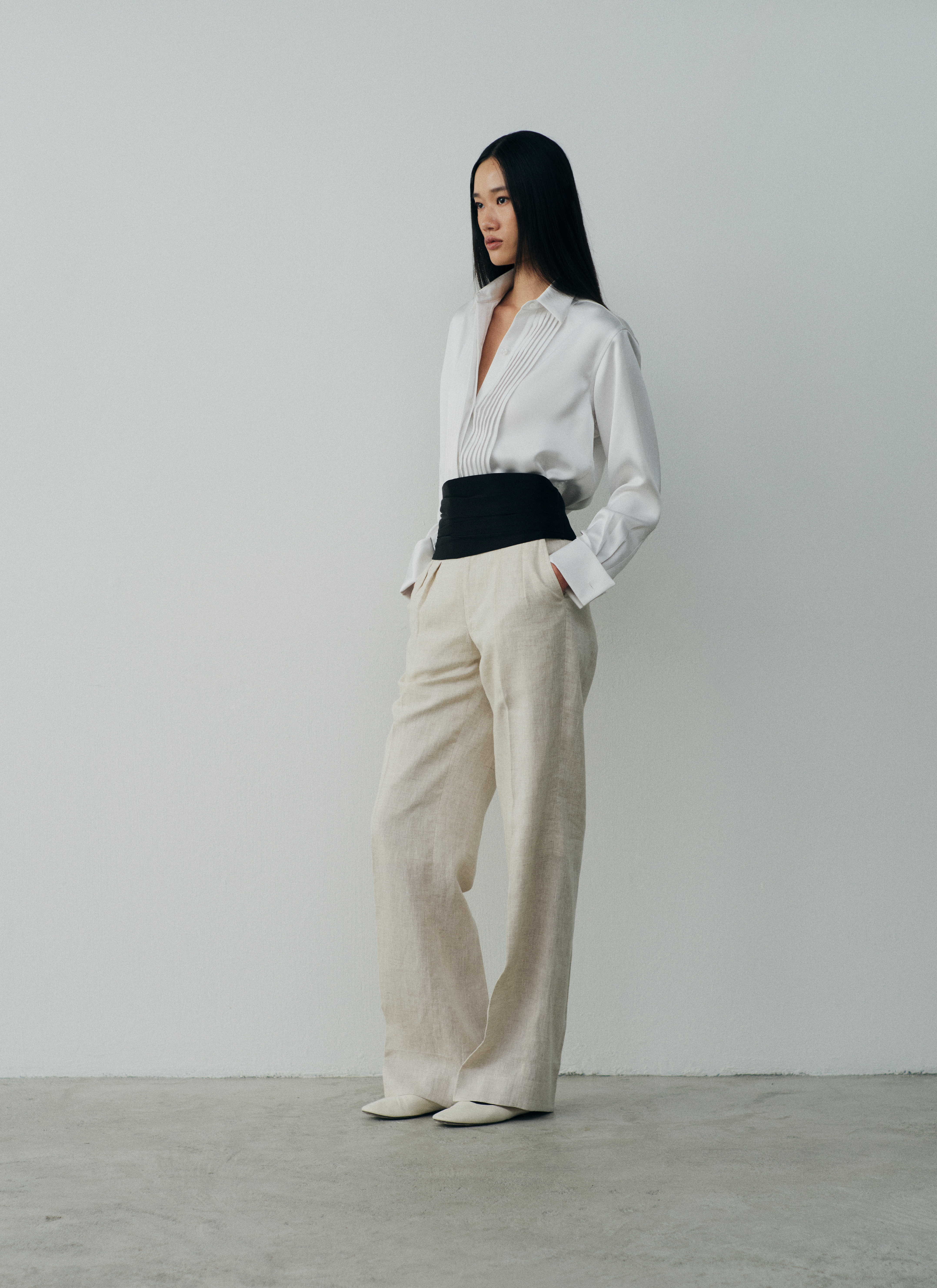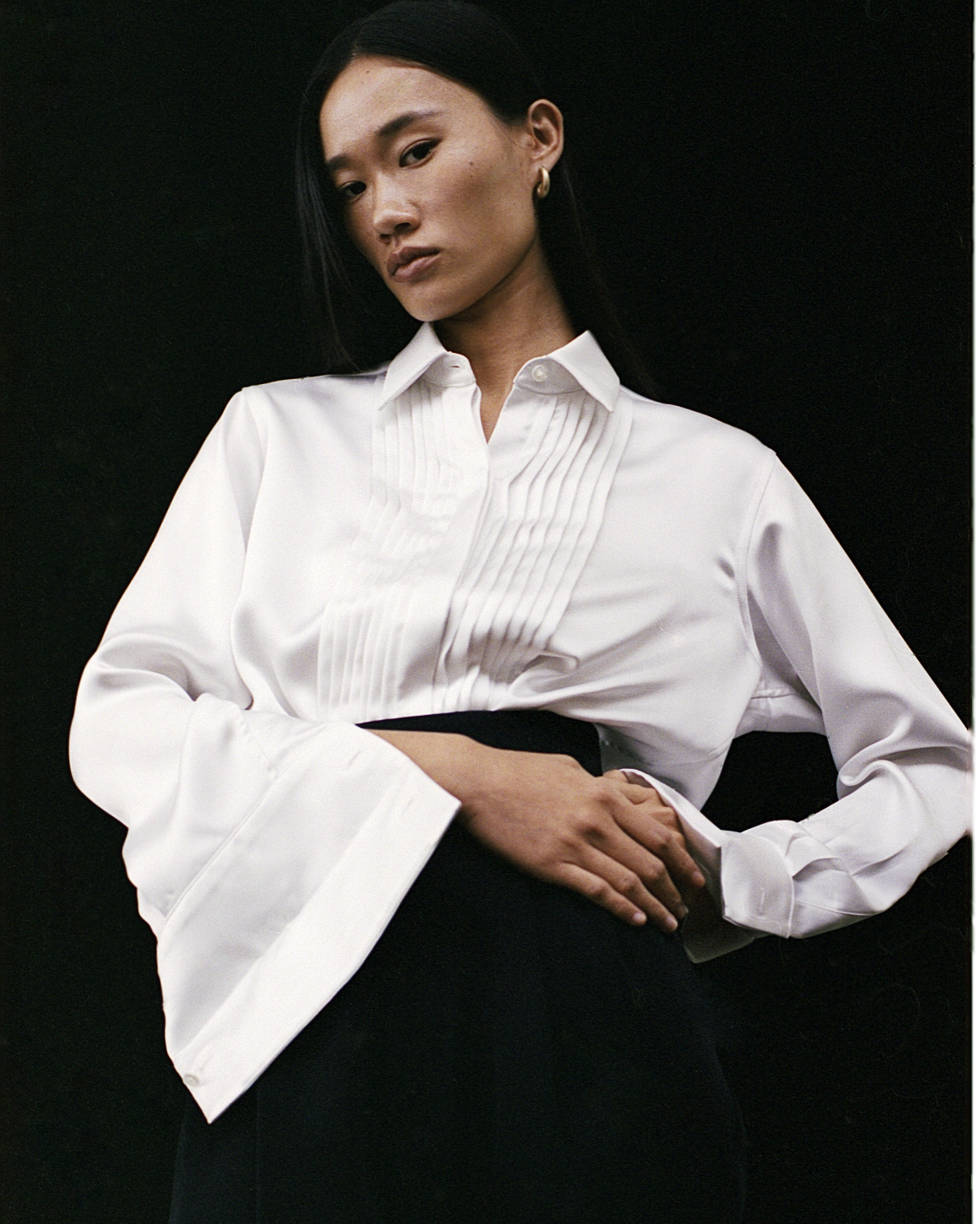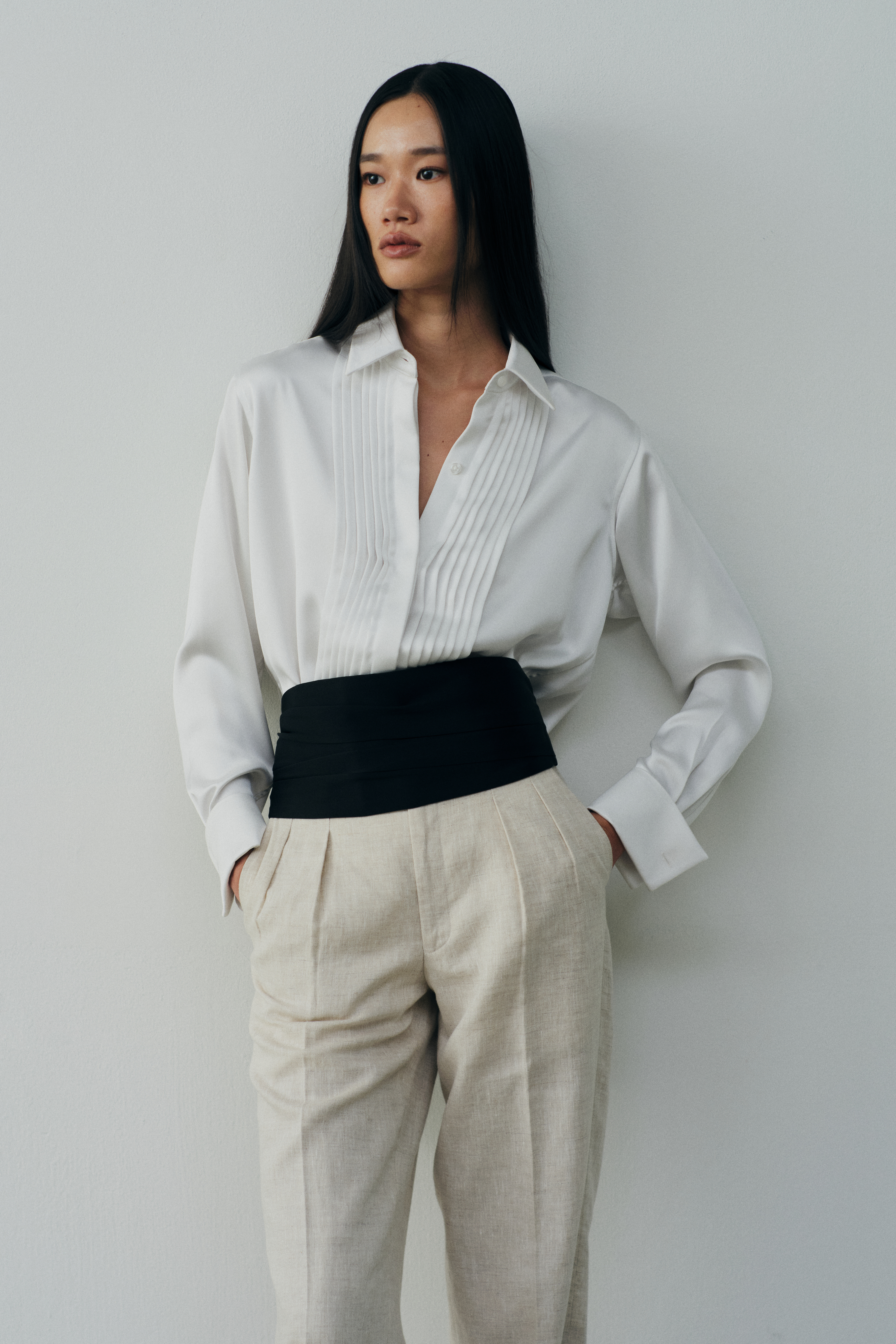 The Claudia Shirt reimagines the tuxedo shirt with a softened stance — balancing masculine structure with fluid femininity.