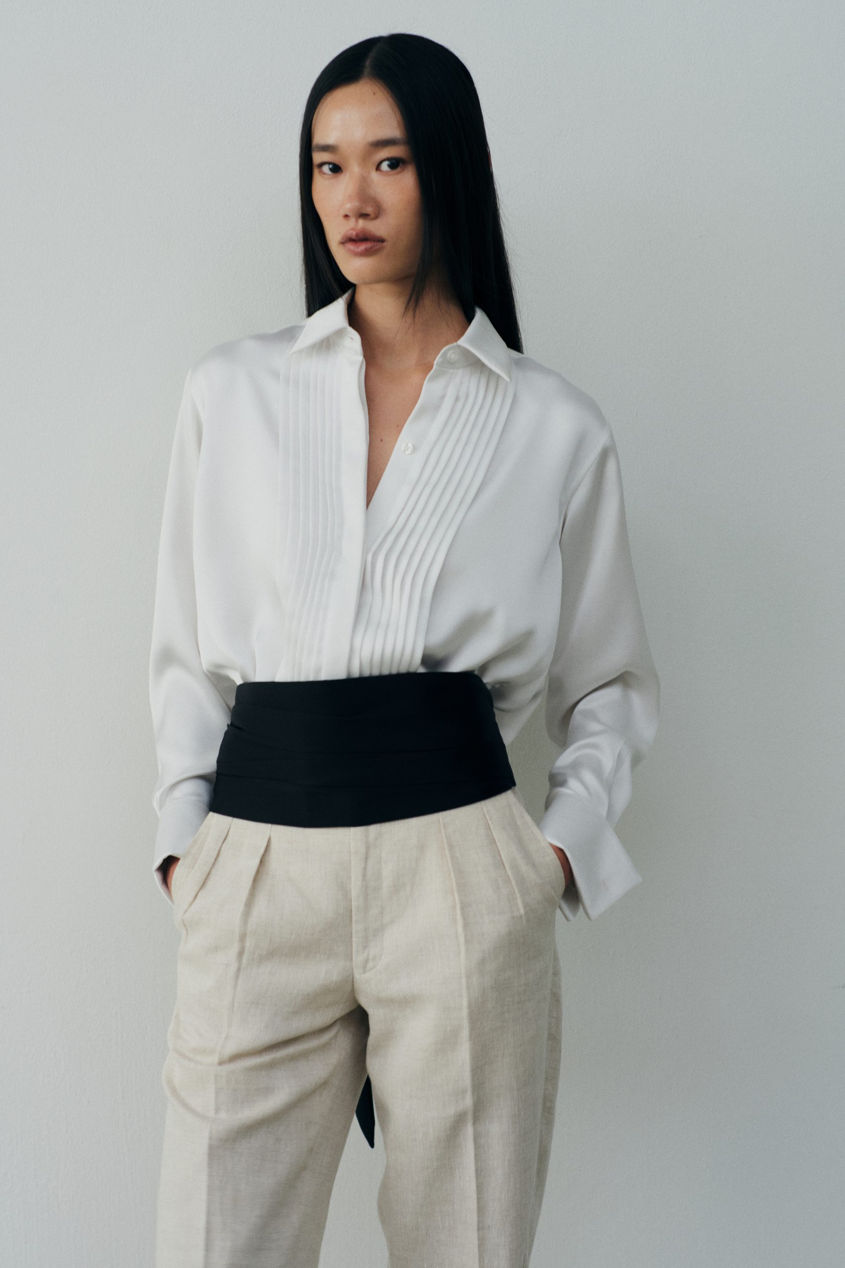 • A softened take on the classic tuxedo shirt — blending structure with fluidity