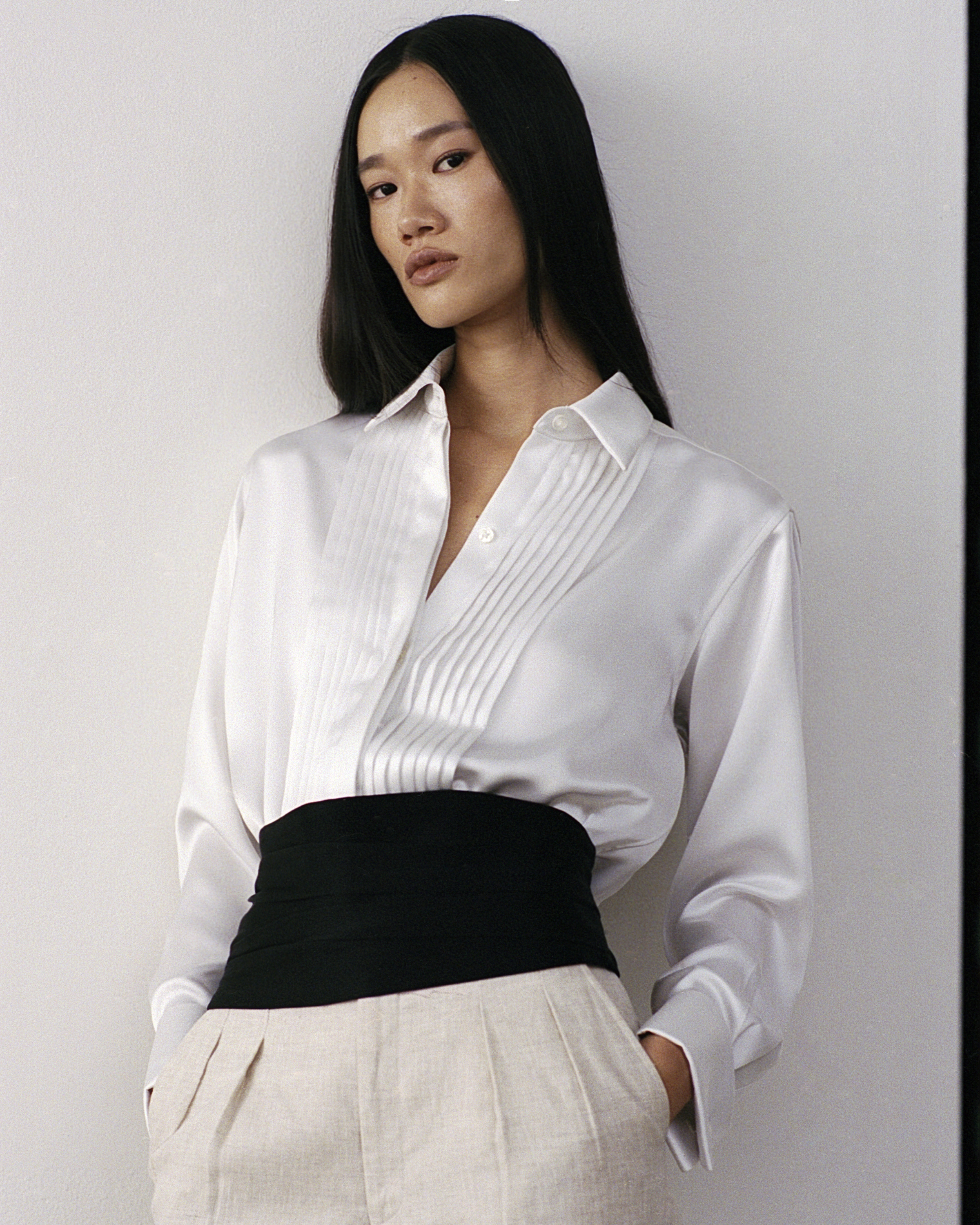 Crafted by hand in double satin — a fabric woven on both sides to offer balanced sheen and structure. It’s finished with a soft super black lining for comfort, control, and lasting shape. Each piece is precisely folded and constructed to hold its form while allowing fluid movement. The feel is polished but not precious, with a drape that ties and flows with ease.