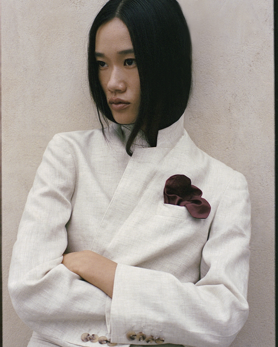 Crafted from 100% Japanese linen, chosen for its breathability and natural grain. Half-lined for lightness, it moves with you while holding its shape. Inside, a striped panel adds contrast without noise. Outside, a quiet detail becomes a focal point — a pocket square in deep burgundy, designed to be worn flat or shaped into a soft bloom, depending on the mood.