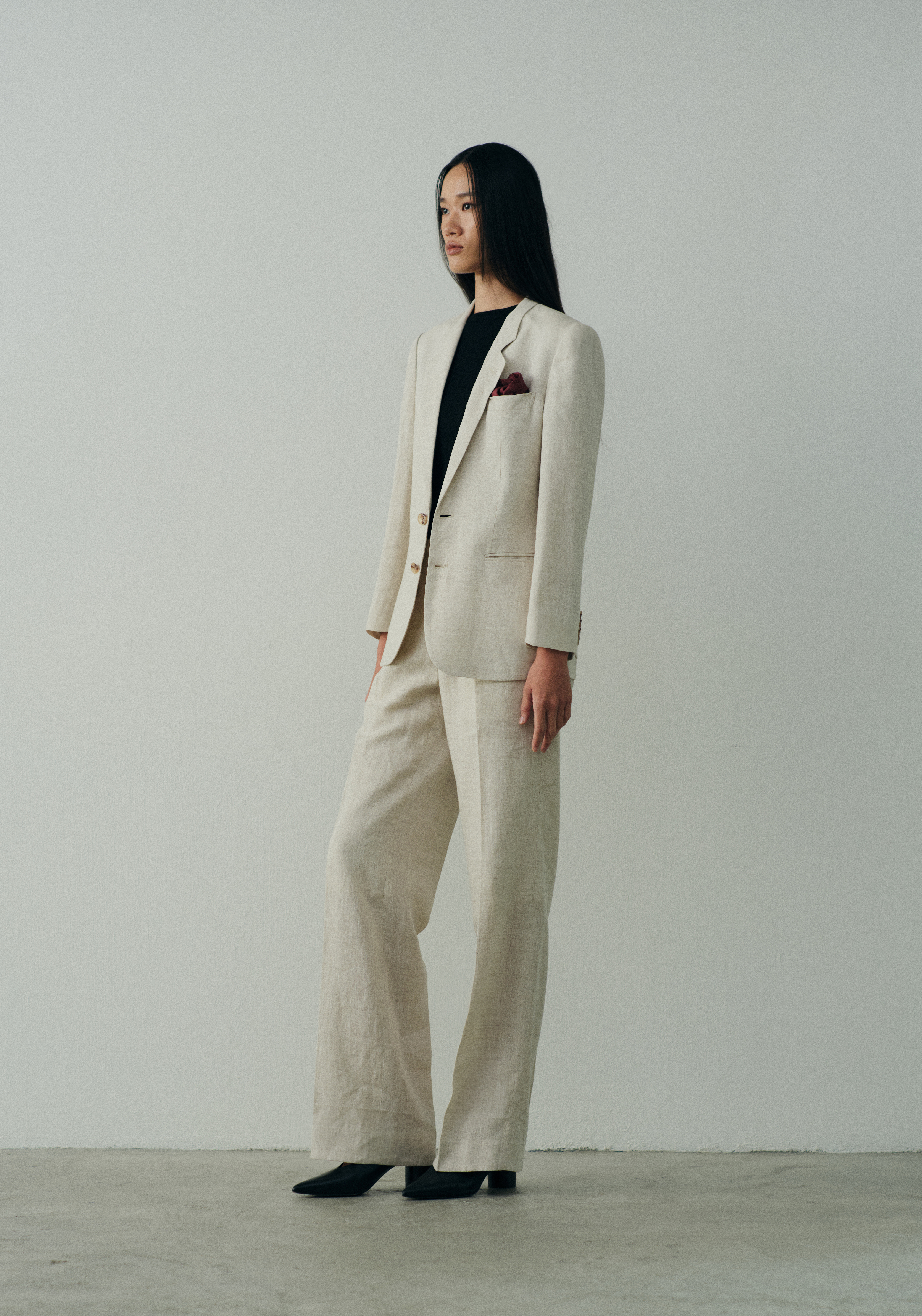 Softly tailored with subtle structure, this linen jacket balances ease and intention. The silhouette is relaxed yet composed — gently shaped at the shoulders, slightly boxy through the body, and cut to fall in a clean, elongated line.